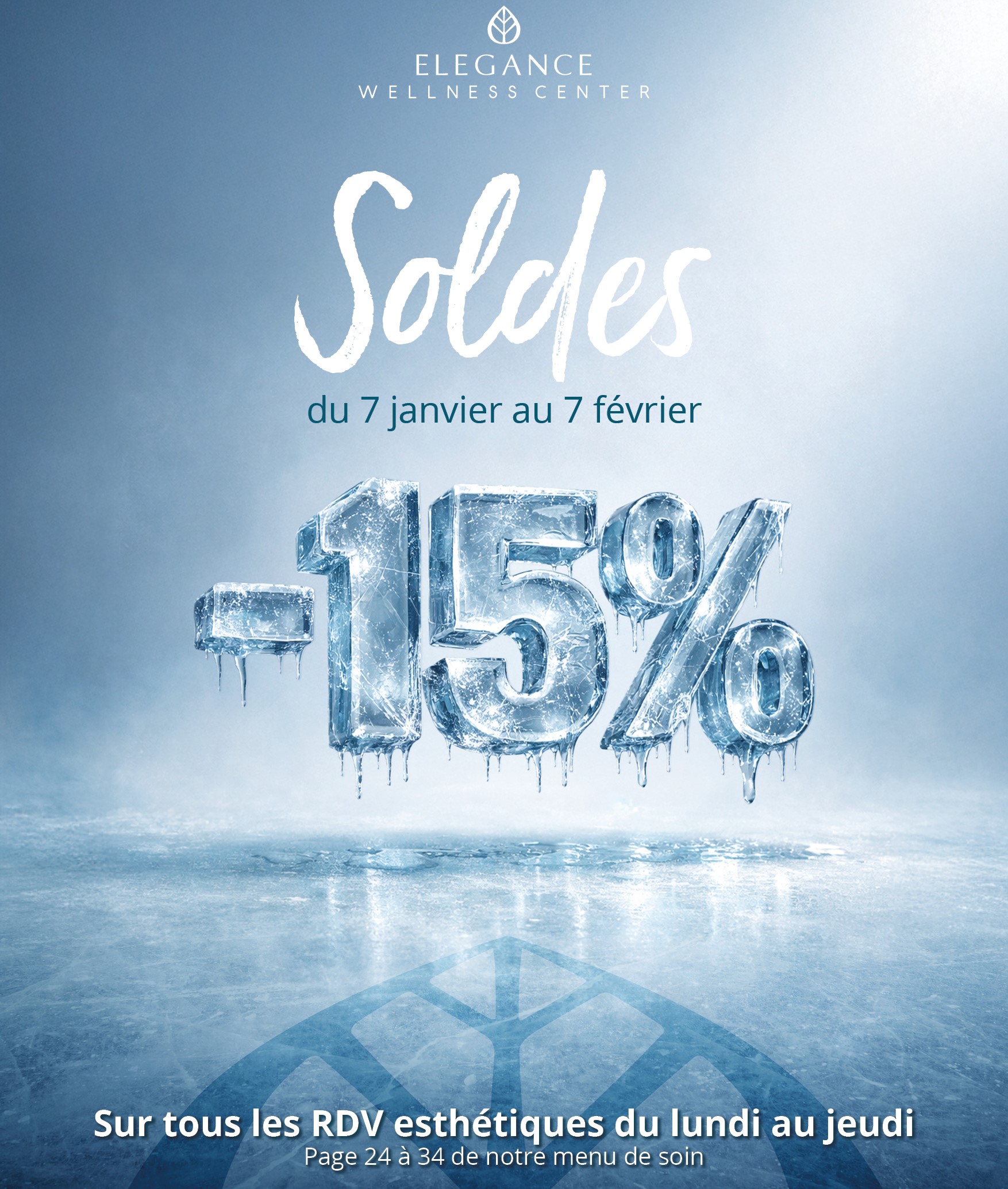 Jusqu’au 7 février, Elegance vous offre 15% de remise immédiate à l’encaissement Boutique sur les RDV esthétiques de la page 24 à 34 de notre menu de soins, du lundi au jeudi.